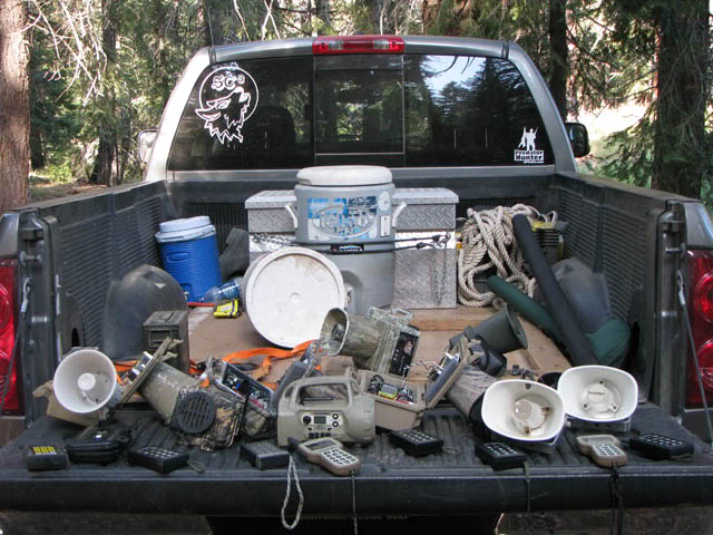 Here's a pic of the collection of electronics a few of us put together at a club campout. None of these are more than a couple of years old, most of them much newer. After some regular hunting using these gadgets you get a pretty good handle on what they do or should do and how they work or should work. Here in the pages that follow, you're getting the benefit of a lot of comparison work and money spent. My hope is that it will be useful to anyone getting ready to buy or upgrade, whether they are brand new to predator calling or a long-time veteran. It ought to be much more useful than the kind of advice you usually get from one of the web's fanboys. I really hate those guys who regurgitate a brochure or a single website and spew crap like,"I got one and it's the best there is. Nuff said." That kind of cheerleading is worthless.