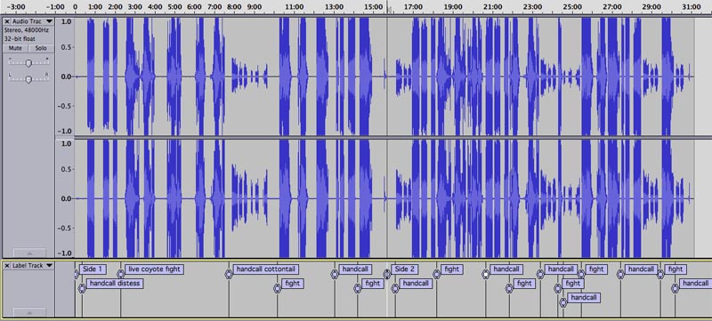 This is the timeline of a cassette tape, Haydel's Coyote Fight. It's a full thirty minutes and was recorded so a hunter could turn it on, put the player in the weeds, and walk away.