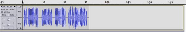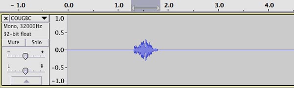 I'm glad that not all the sounds were 15 or 30 minutes long. Digitizing old cassette tapes, deconstructing CDs, and comparing the results to short proprietary files with camouflaged loop lengths is challenging There is a huge difference between a 30 minute plastic cassette tape, a 15-minute track on a Compact Disc, an MP3 file attached to an email, and a 0.4 second sound file graphed on a digital editor. They are not equal. Pay attention to the time scale at the top of each of the graphs that follow. They range from minutes to milliseconds. The next whole graph is only 4 seconds and the sound, Wildlife Tech's Cougar Baby, is less than half a second, and then it repeats. This sound probably qualifies as the shortest single sound ever sold to the public for predator calling, for $30 no less.