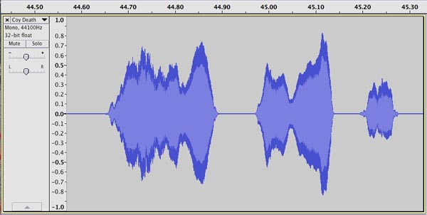 The sound above isn't loud enough nor is it silent between the sound. Moving on, the sound shown below is the same as the one above except a filter was used to reduce noise. The silent portions between the animal screams should ideally be silent. Filtering the noise is something that should be done before the sound is sold to the public. This was a cassette tape. Cassettes seem to lose some of their gusto in time. Whether this was recorded improperly or is just an old tape is anyone's guess.